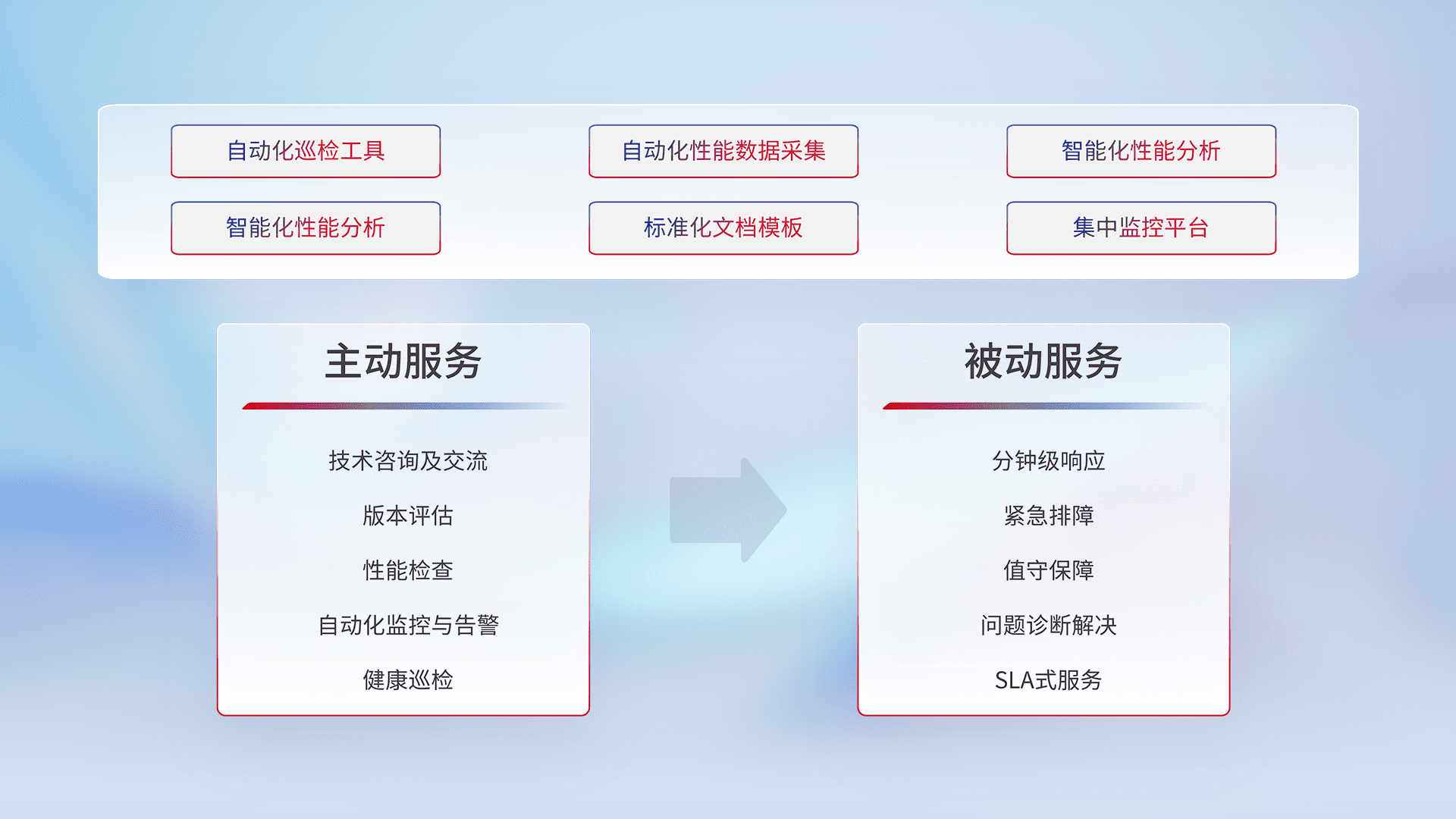 智能化工具和标准化文档,,,保障服务质量,,,提供主动服务(包含技术咨询、、版本评估、、、性能检查、、、、自动化监控与告警、、、、健康巡检)和被动服务包含(分钟级响应、、紧急排障、、、值守保障、、、、问题诊断解决、、、SLA服务)。。